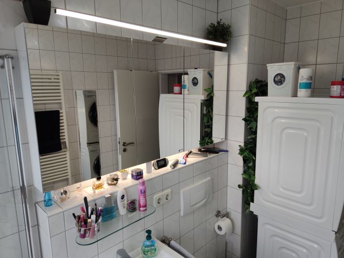 - Spacious Bathroom: Features a bathtub, shower, window for natural light, ventilation, a sink cabinet, illuminated mirrored cabinet, and washing machine and dryer connections.
